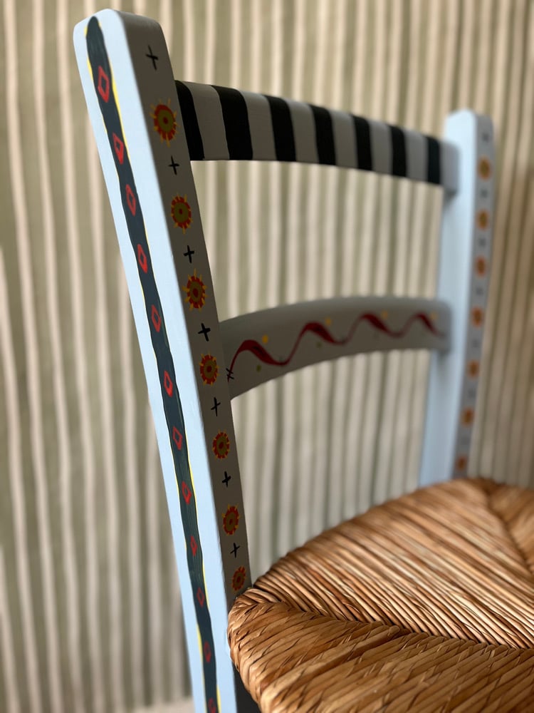 Handpainted child’s chair with straw seat, suitable for an older child, age 3 and up.