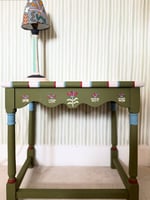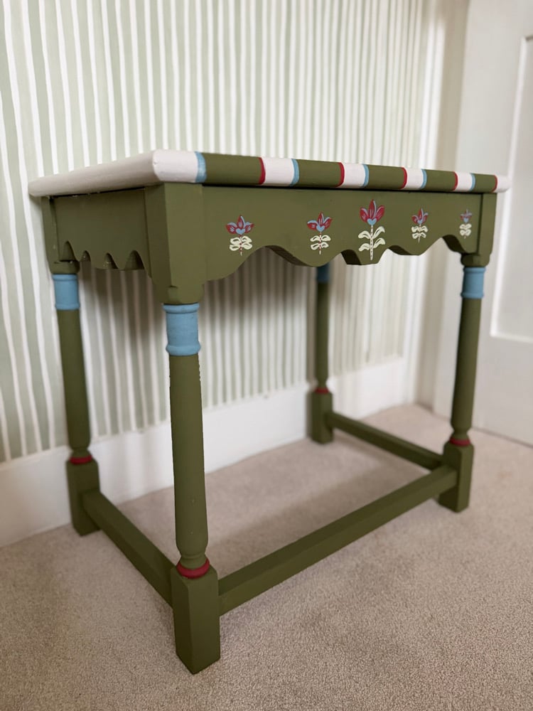 Hand-painted side table in Farrow & Ball Bancha, Incarnadine, Stone Blue, and Cooking Apple Green.