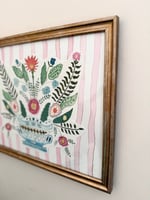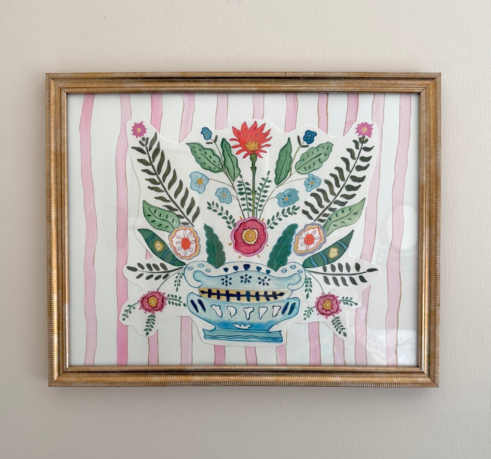 Gouache folk art flowers, cut out and laid against a striped watercolour background.